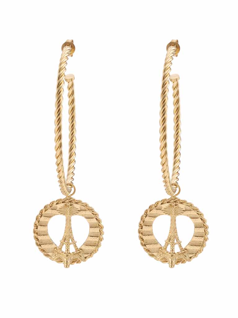 Geef je outfit een betekenisvol accent met deze gouden oorringen met vredesteken hanger. Het moderne design staat voor balans en harmonie, en is ideaal om je look krachtig en stijlvol te maken.