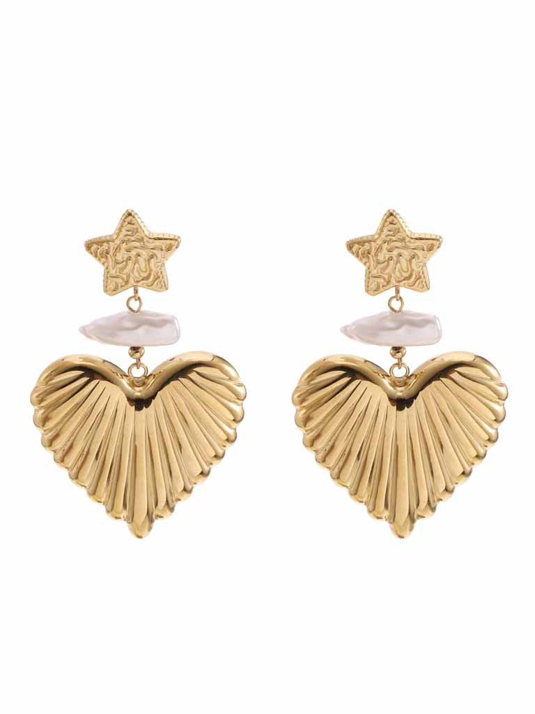Maak een gedurfd statement met deze gouden oorbellen met sterren en hartdesign. Perfect om je look extra glamour te geven tijdens feestelijke gelegenheden.
